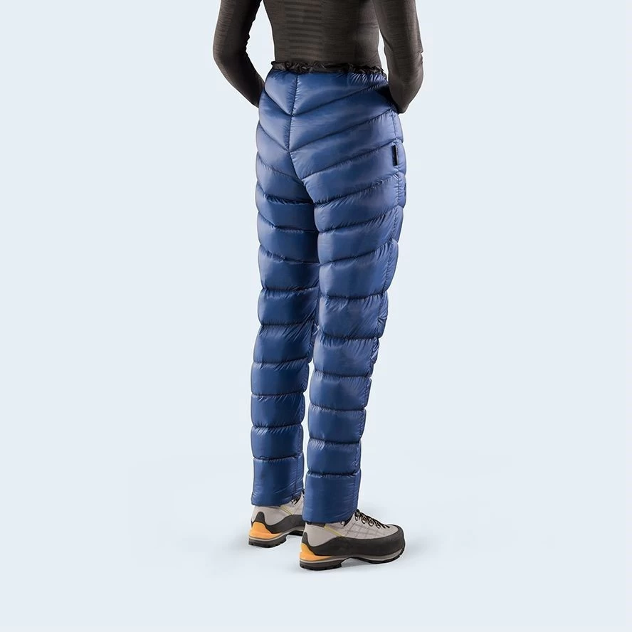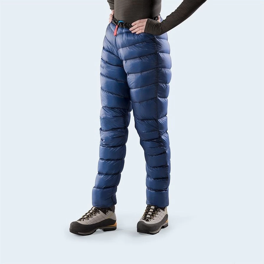 Il est réalisé en Toray Airtastic. Un tissu ultra-léger de 19 g/m² qui est respirant, coupe-vent et également agréable au touché. Il reste suffisamment dense pour être étanche au duvet, pas de fuite de plumette. Son garnissage de qualité en duvet d’oie polonais 850 cuin est hydrophobe. En taille M, le pantalon renferme 102g de duvet.