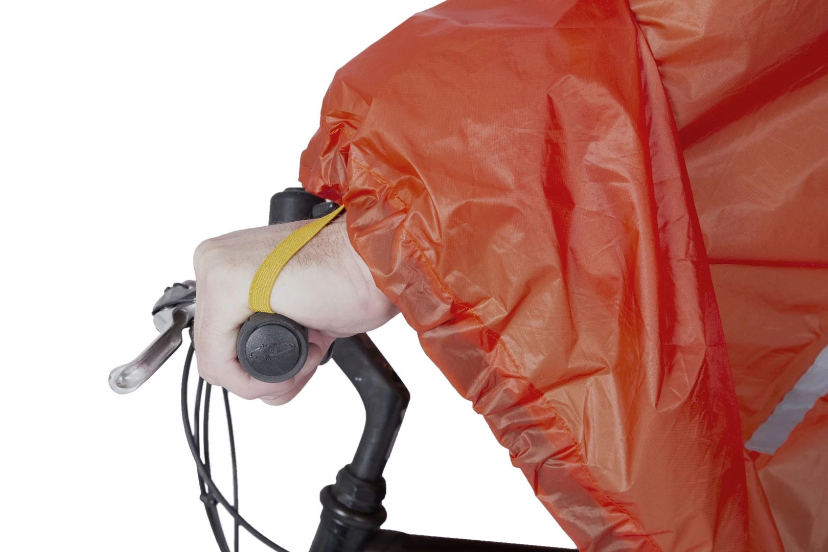 La sacoche de rangement est intégrée : elle sert également de poche intérieure. Un velcro permet de rouler le poncho et de le fixer sous une selle à vélo