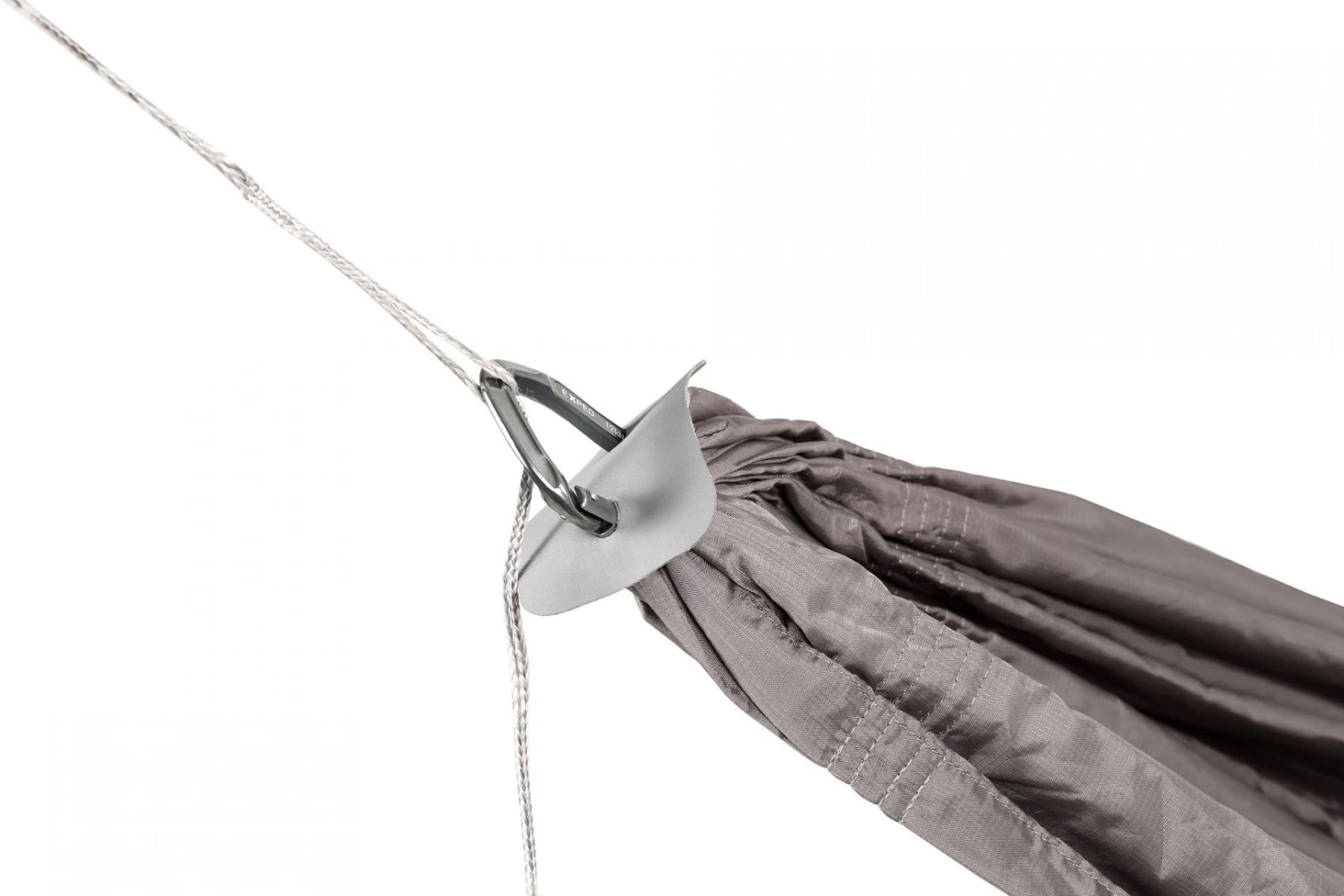 Hamac livré avec le système d’attache « Drip Clips » : il s’agit de mousqueton équipés d’une goutière. En cas de pluie, la gouttière empêche l’eau de ruisseler le long des suspentes et de détremper le hamac.