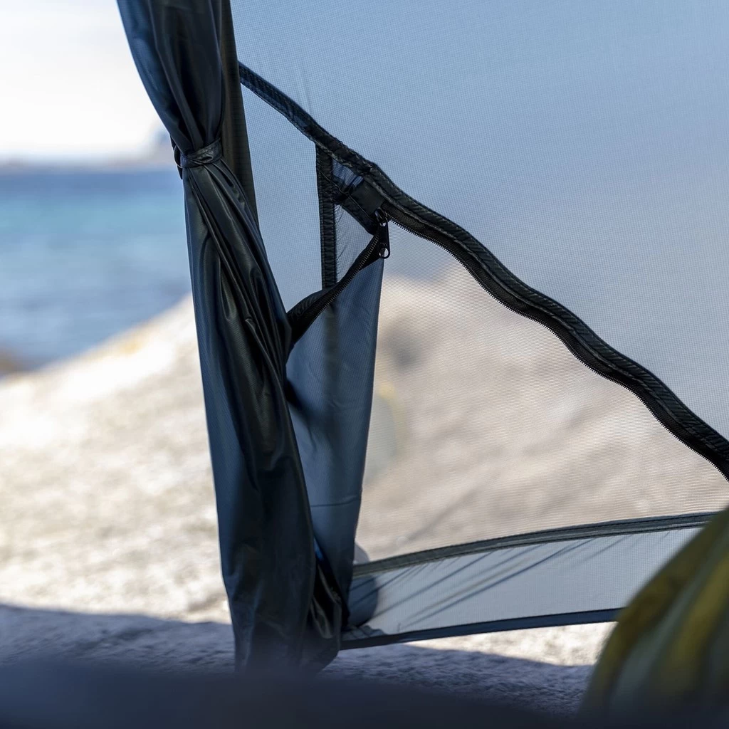 Pour assurer une bonne ventilation et donc éviter la condensation, la tente dispose d’aérations en moustiquaire sur le double-toit et de maille sur les portes de la toile intérieure. L’air passe mais pas les moustiques ! La fermeture à 360° de la toile intérieure permet de se sentir au contact direct de la nature lorsque les éléments le permettent. Lors du montage, la chambre intérieure est directement en place, mais il est possible de l’enlever pour bénéficier d’un abri plus grand. Cela permet également de démonter la tente sans mouiller la chambre lorsqu’il pleut.