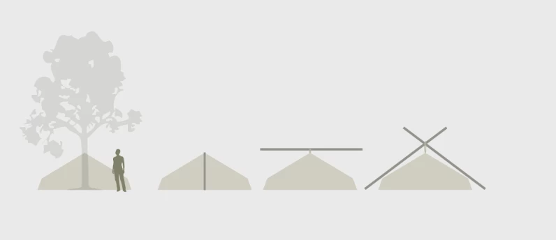 - Suspendue à deux arbres grâce aux sangles situés sur le haut de l’abri