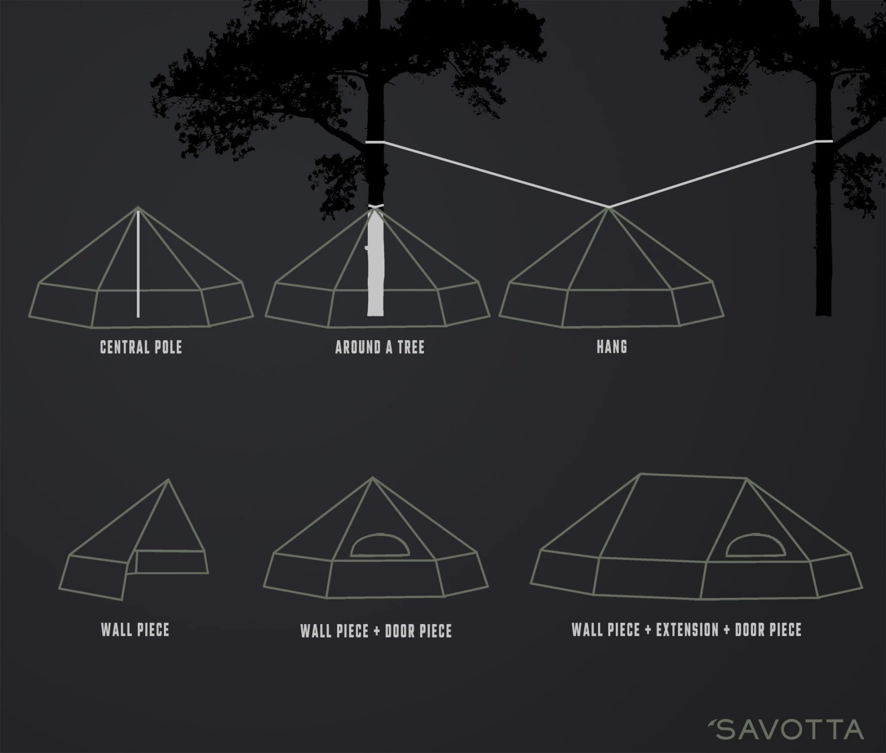 - Wall Piece + Door Piece : le Wall Piece peut être installé en complément de la Door Pièce, ce qui permet de former une tente complète.