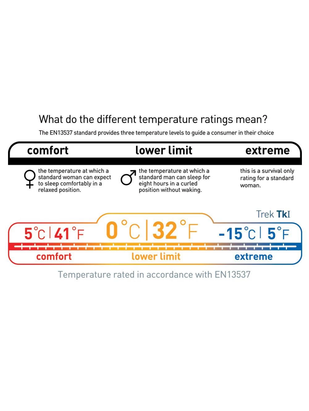 Grâce aux caractéristiques techniques, le Trek TK1 obtient une température confort de 5°C ce qui est performant au regard du volume et du poids total du sac de couchage.